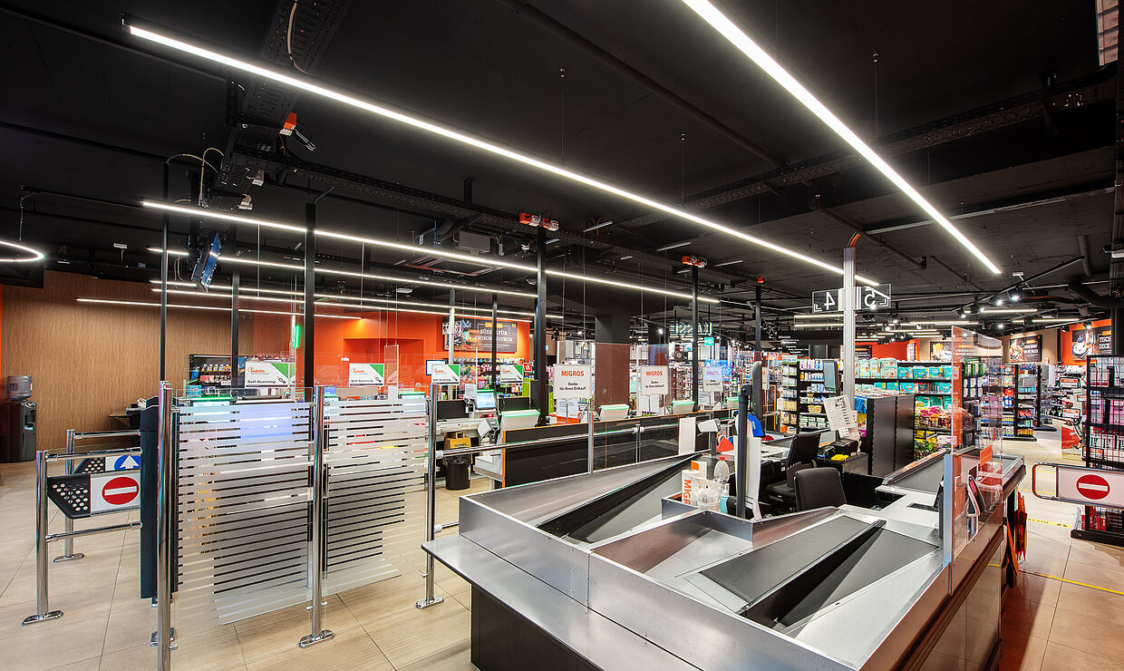 Der Migros-Supermarkt Drachen-Center in der Basler Innenstadt erstrahlt in einem neuen, frischen Look und Regent Lighting rückt die Kassenbereiche mit der stylischen PURELITE SLIM D in optimales, entblendetes Licht